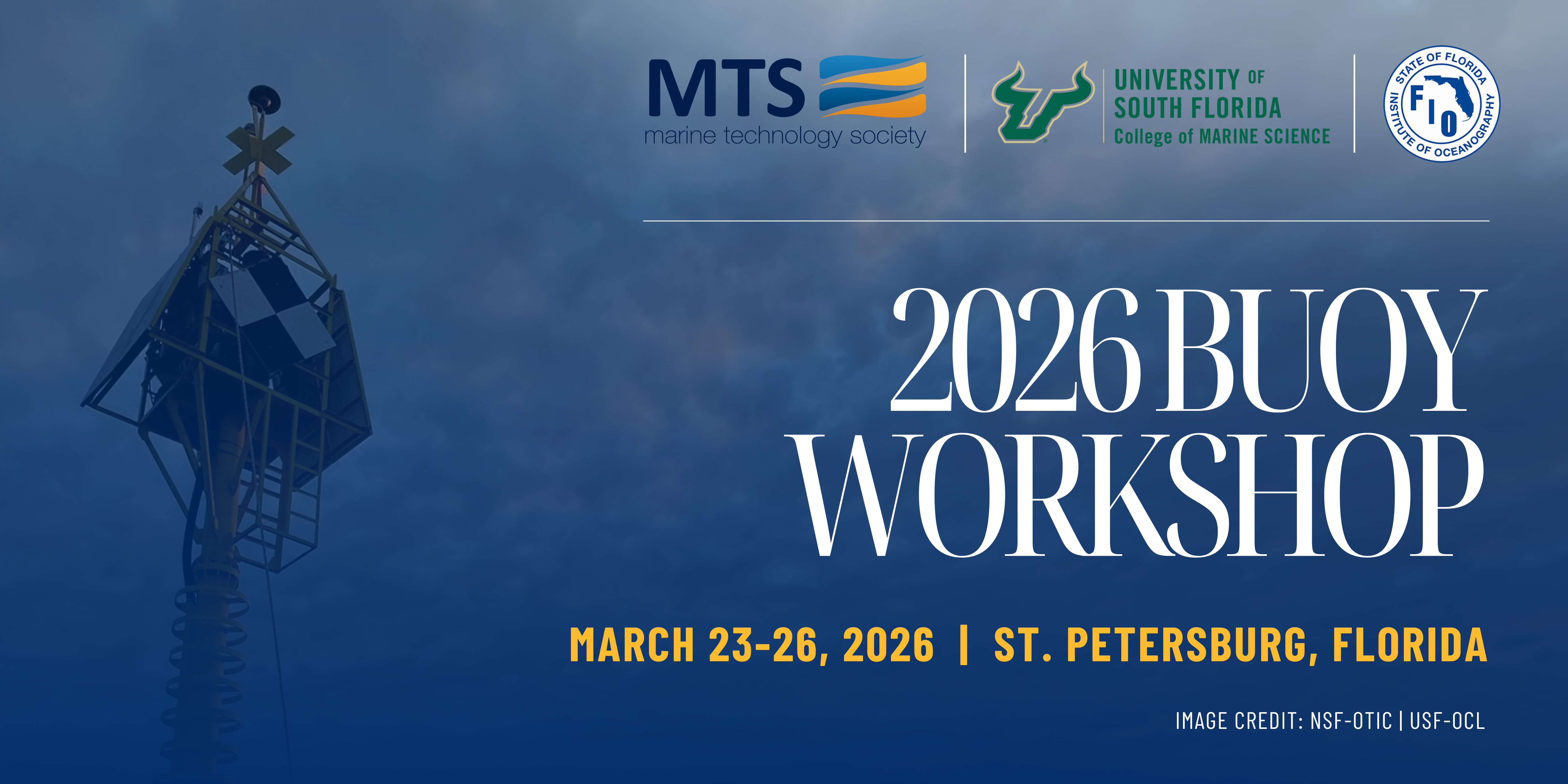 Buoy Workshop16th Buoy Workshop - March 23-26, 2026You are cordially invited to join us for the 16th MTS Buoy Workshop sponsored by the Marine Technology Society (MTS) to present and share your buoy-related work and projects to all attendees. Since the 1960s, these workshops have covered the technology of oceanographic, weather, and other buoy systems. Originally based on the suggestion and support by the Office of Naval Research, buoy workshops have been organized and supported every two years since 1996 to foster communication and exchange between designers, assemblers, operators, and users of buoy systems. This year's Workshop, presented in partnership with the Florida Institute of Oceanography and the University of South Florida-College of Marine Science, begins with a pre-event seminar and workshop presented by ProteusDS on Monday afternoon, March 23, followed by an evening Ice-Breaker. The Speaker Program runs from Tuesday morning, March 24, through Thursday afternoon, March 26 (concluding around 5:00 p.m.). On Wednesday afternoon, participants will tour host facilities engaged in active buoy projects, with a networking reception to follow that evening. About Our Workshop Partners